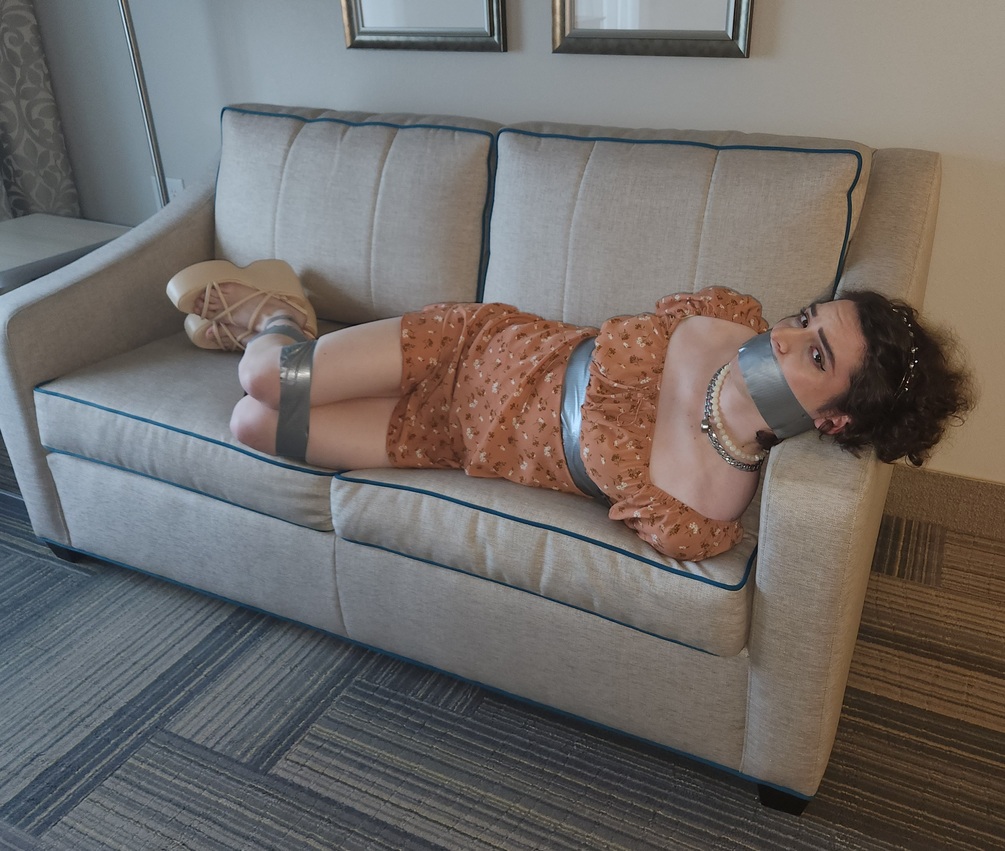 Valkyrie taped up in 2 different photo sets. 1st she is in a cute dress with platform sandles. Taped up well with wrap around tape gag and tape over her eyes. 2nds set has her taped up after her jog. Her sock is removed and shoved in her mouth and taped up.